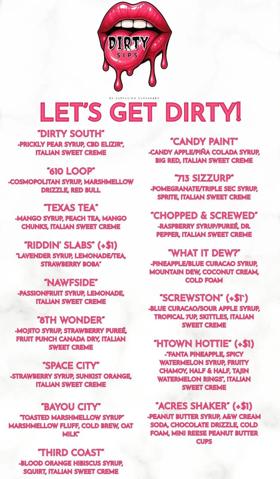 If you’ve visited a Cupfusion booth before, you already know we love bringing Houston treats that go beyond the ordinary. And now, we’re turning up the sweetness with a brand-new creation: Dirty Sips, our first-ever dirty soda line — available exclusively at Cupfusion pop-ups.